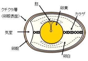 外側から卵殻、卵殻膜、卵白そして中心に卵黄があります。 卵殻膜は内外2枚あり、内膜で卵白の表面を包んでいますが、産卵後卵が冷えると、内外膜が分離して鈍端部に気室を作ります。